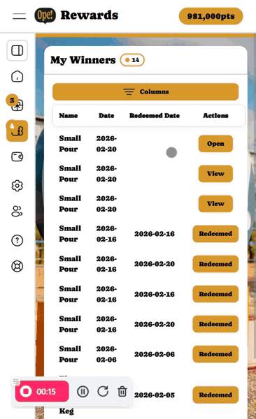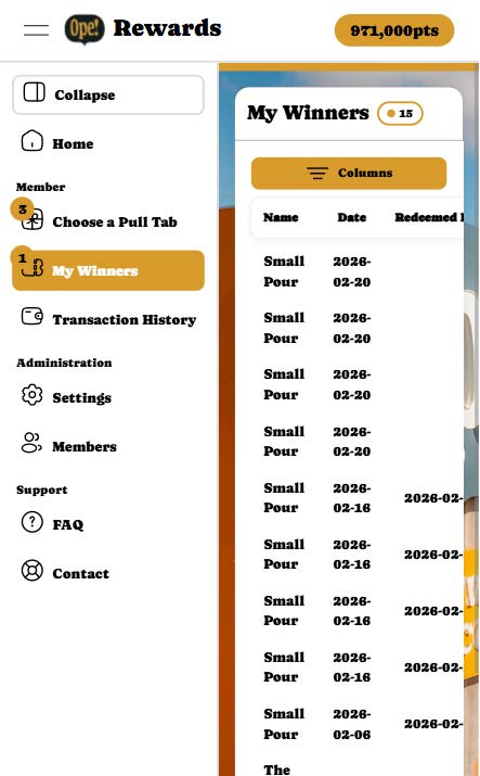 To open a newly claimed pull tab, click on "Open" on the corresponding pull tab within the "My Winners" page. Below is a gif showcasing how to open a pull tab.