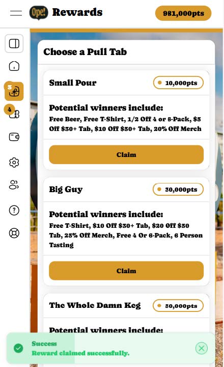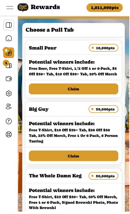 There are three tiers of pull tabs with increasing point values: Small Pour (10k points), Big Guy (30k points) and The Whole Damn Keg (50k points). If you have enough points in your balance, you will be able to redeem the according pull tab tier. If you do not have enough points, the corresponding tier will be greyed out.
