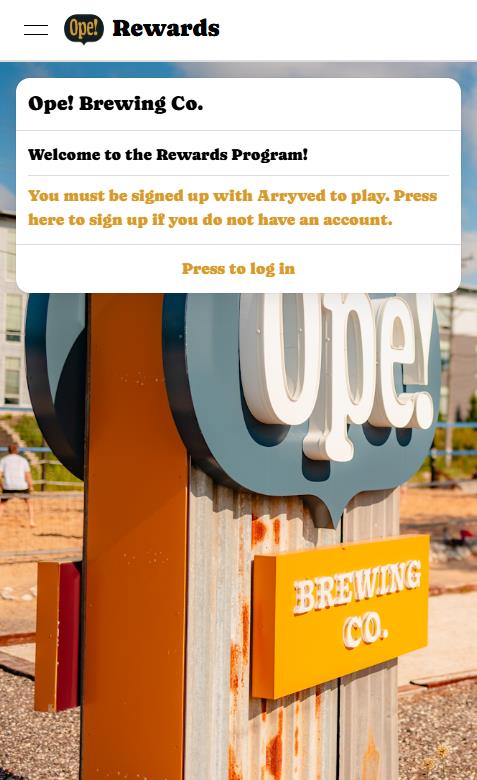 Once you have completed and confirmed your Arryved Insider account, head to https://opebrewingco.creamcityinnovations.com/ to log in. You will be brought to a Cream City Innovations site (a partner of Ope! Brewing) which will prompt you to "Press go log in" where you will then be asked to sign in with your email. MAKE SURE TO USE THE SAME EMAIL YOU USED TO SIGN UP FOR THE ARRYVED INSIDER PROGRAM. Again, these are one and the same.