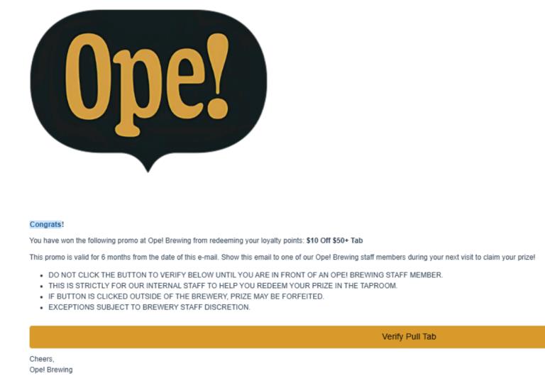 Once you've opened the pull tab, you will be presented with a message stating your prize. From here, click "Confirm" on the pop-up which will also send you an email with verification of your claim and prize win. The email will be sent by our partners at [email protected].